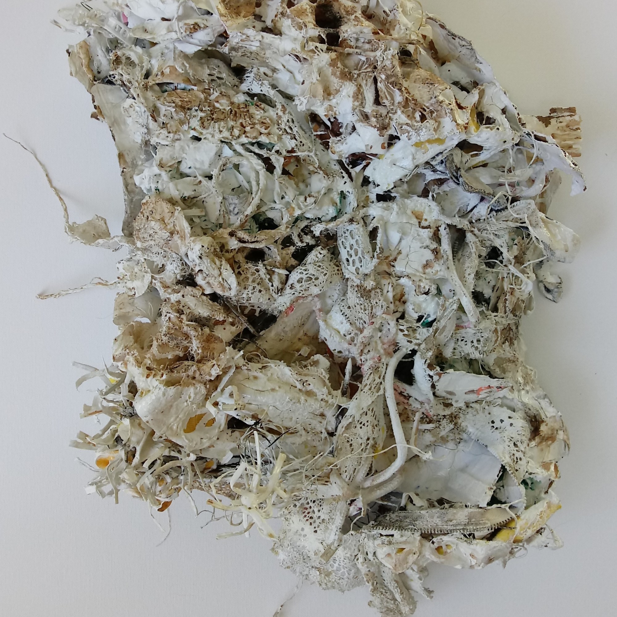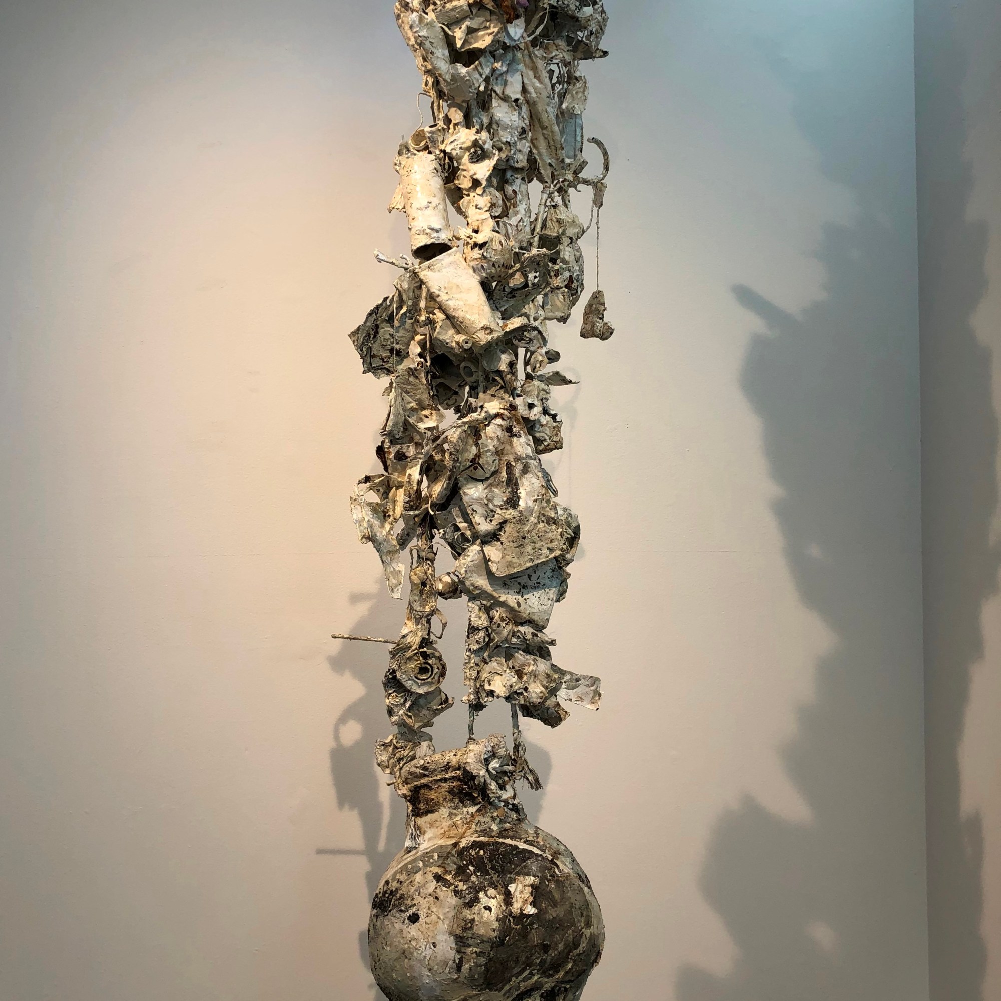 These complex sculptural forms made from familiar household detritus capture moments of life’s journey that are grounded in the mundane.
