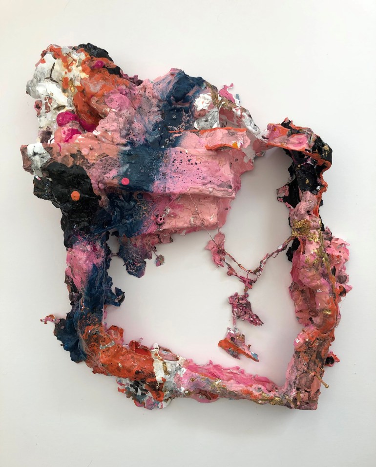 Anna Macrae is interested in the physicality of materials as she plays with the notion of space and form. She uses paint as a sculpting medium effectively on a large and small scale. The surface quality of her pieces captivates the viewer and invites for an intimate exploration of the terrain.