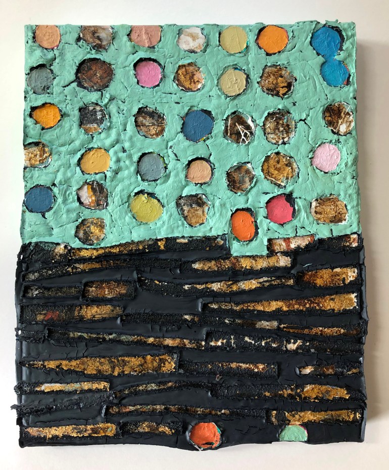 “My intention with my art making is to take everyday detritus from our apparently average lives, and build sculptural forms and paintings to honor our shared experiences and connections. My aim is to make beautiful messy imperfections reflecting life’s journey of discovery whilst being grounded in the mundane.”