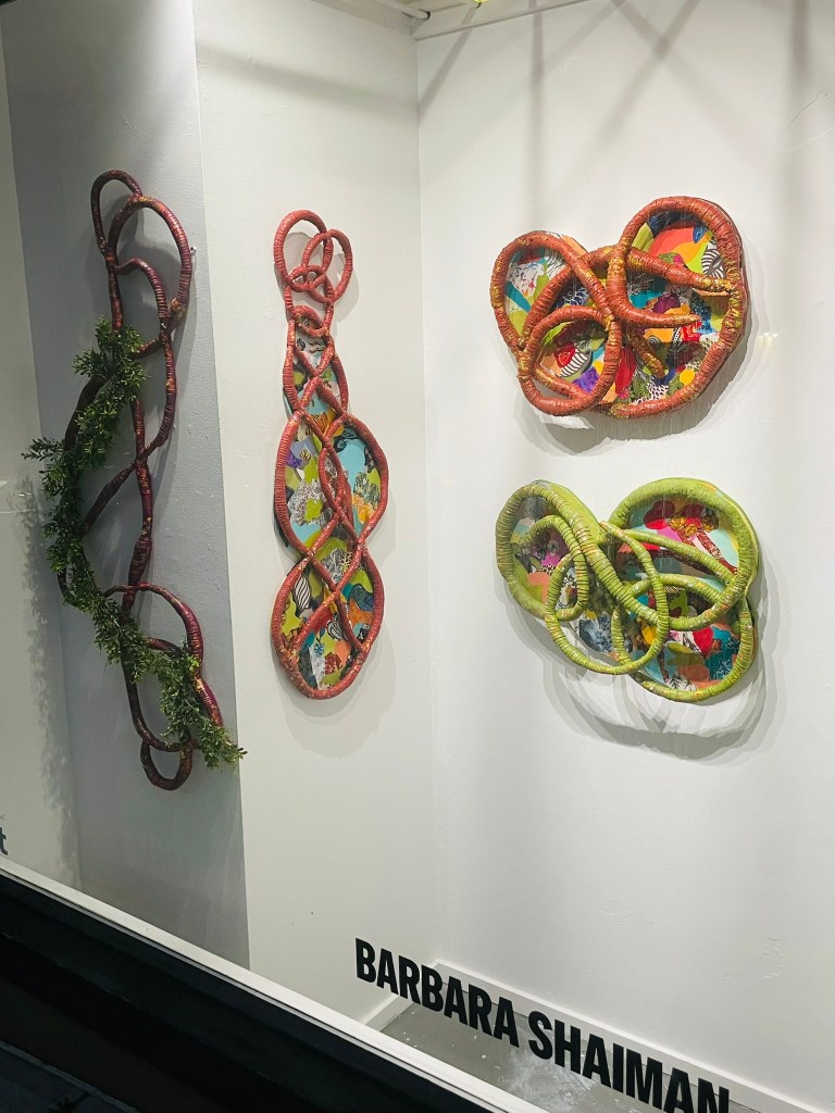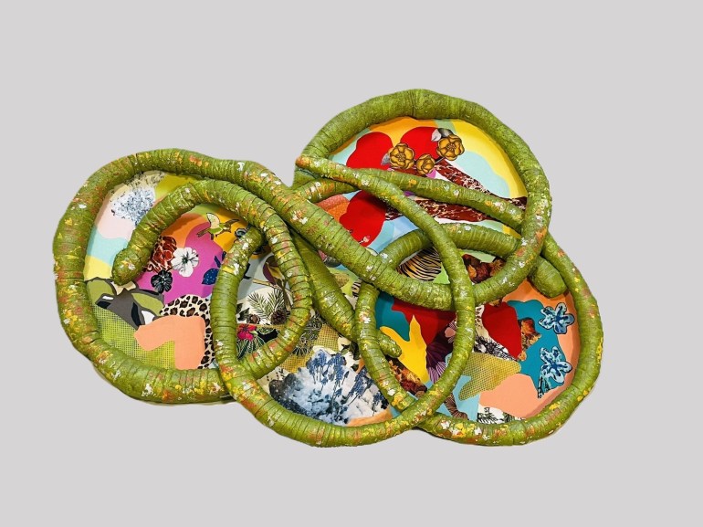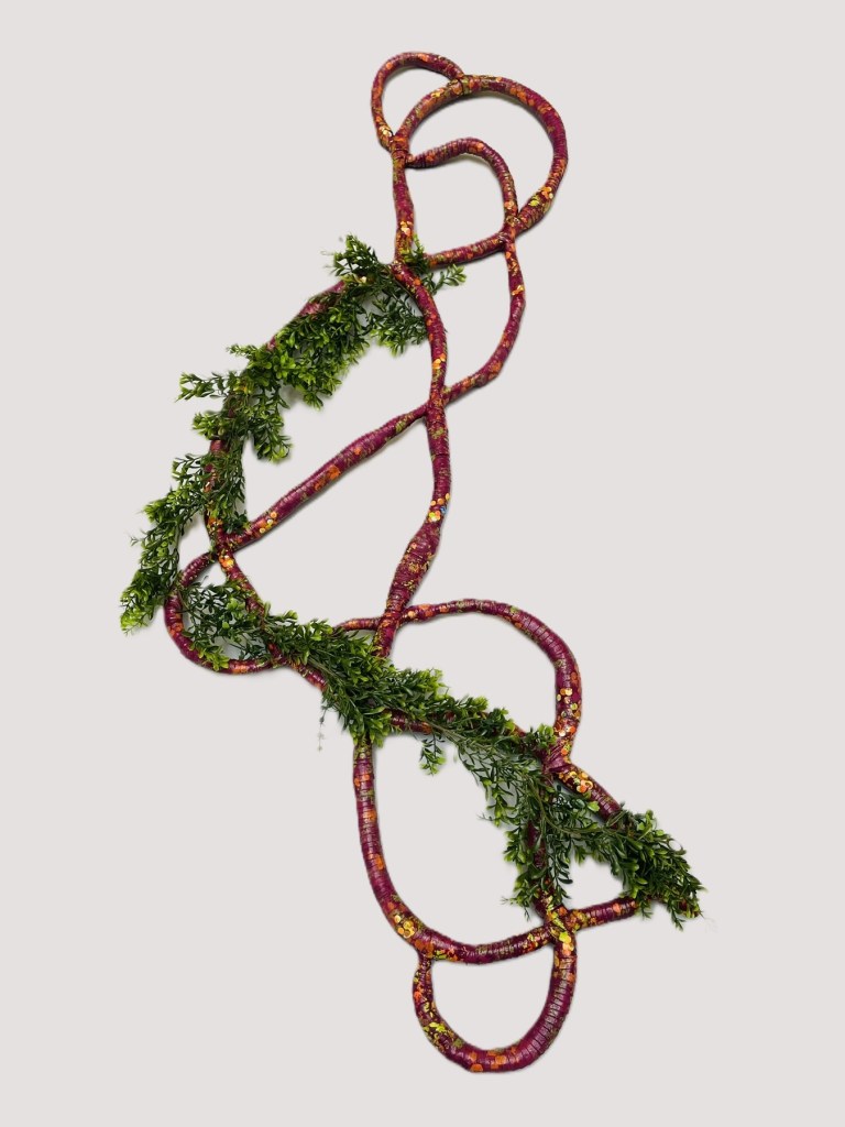 ENTANGLEMENT features four recent, colorful, wall mounted works in upcycled fabric, wire and mixed media that explore the dynamics of our relationship with the natural environment.