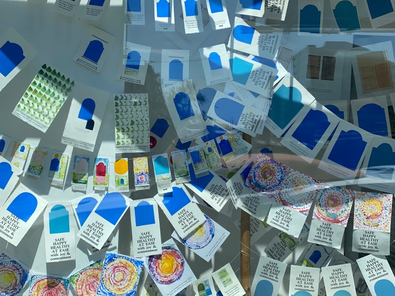 The contemporary prayer flags show in the Shift Gallery window combine the artist’s Buddhist practice and her love of watercolor and letterpress printing.