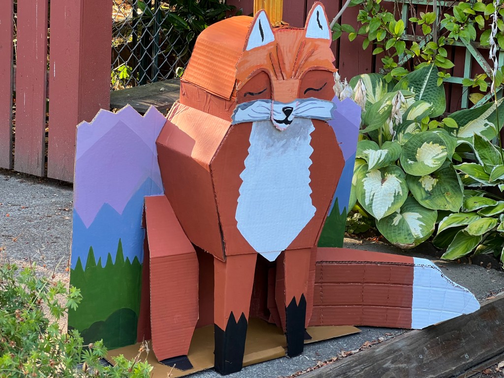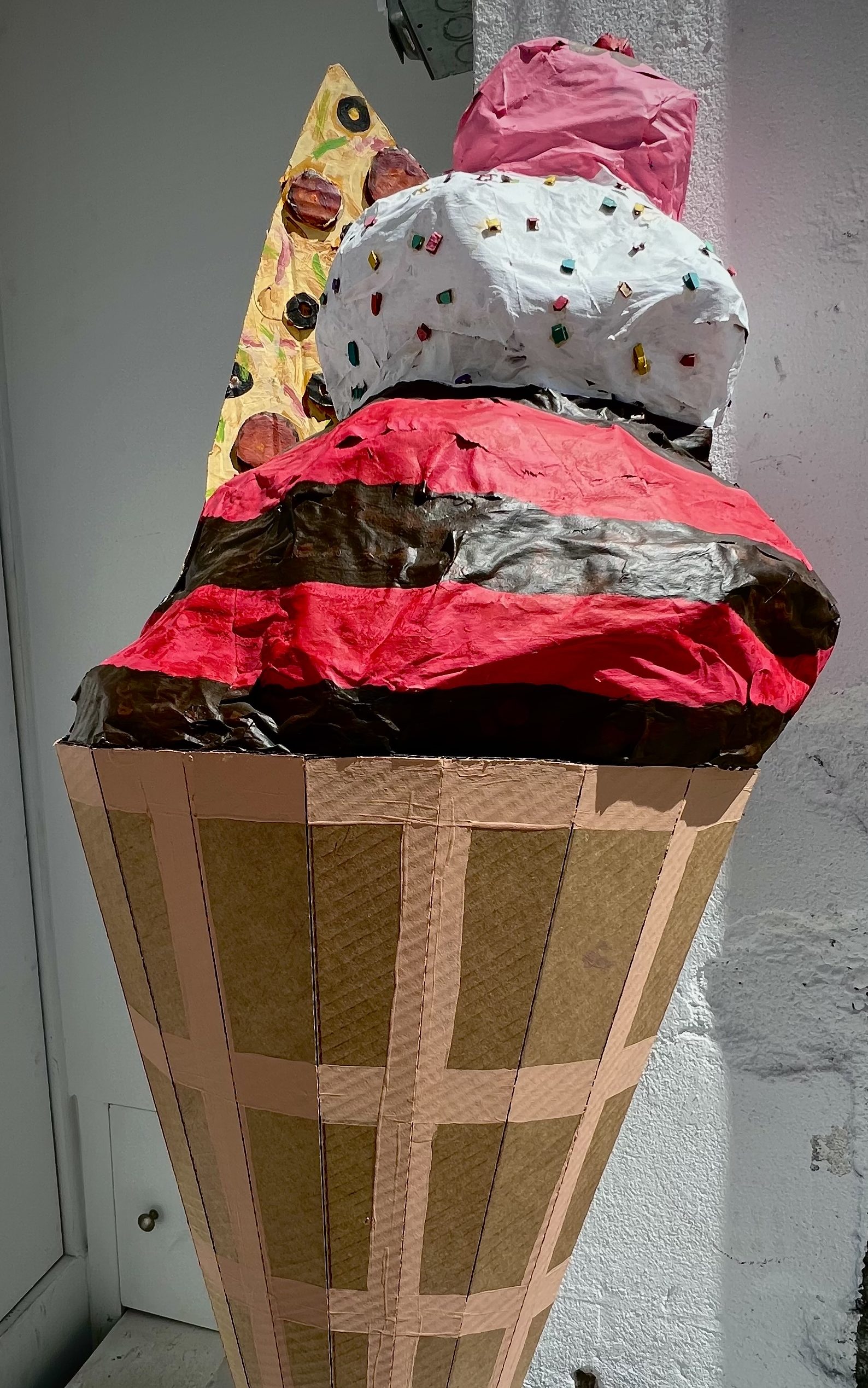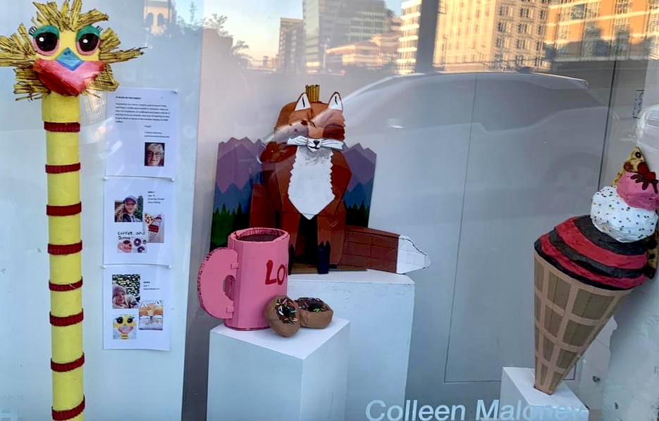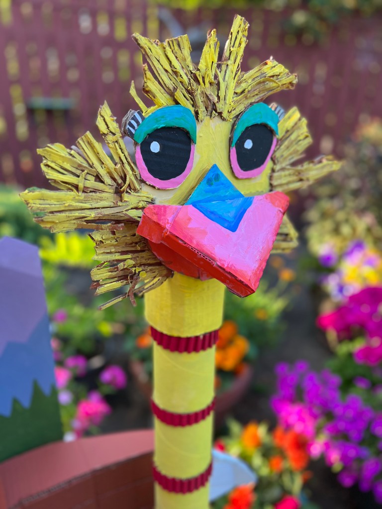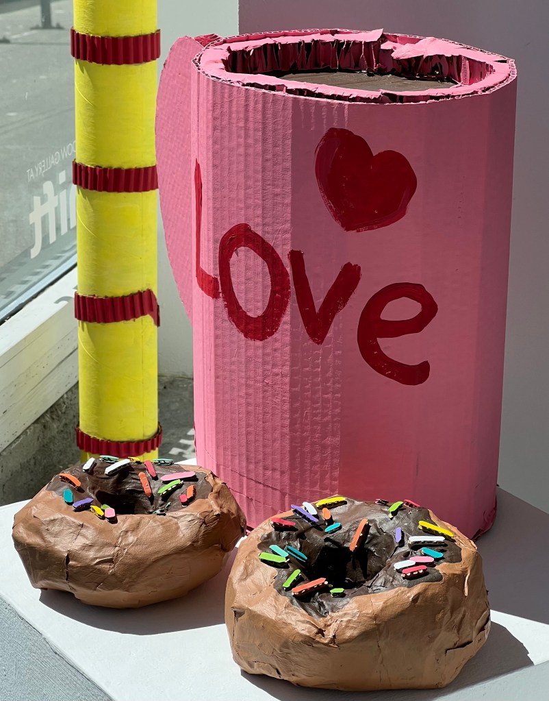 Inspired by her clever, creative grand niece artists, Colleen’s challenge was to transform their drawings into 3-D sculptures of cardboard and paper maché. She enjoyed constructing, measuring, and fitting parts together that were strong and visually engaging.