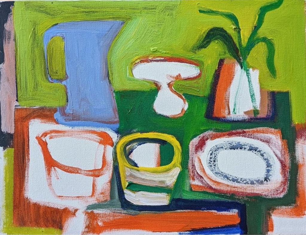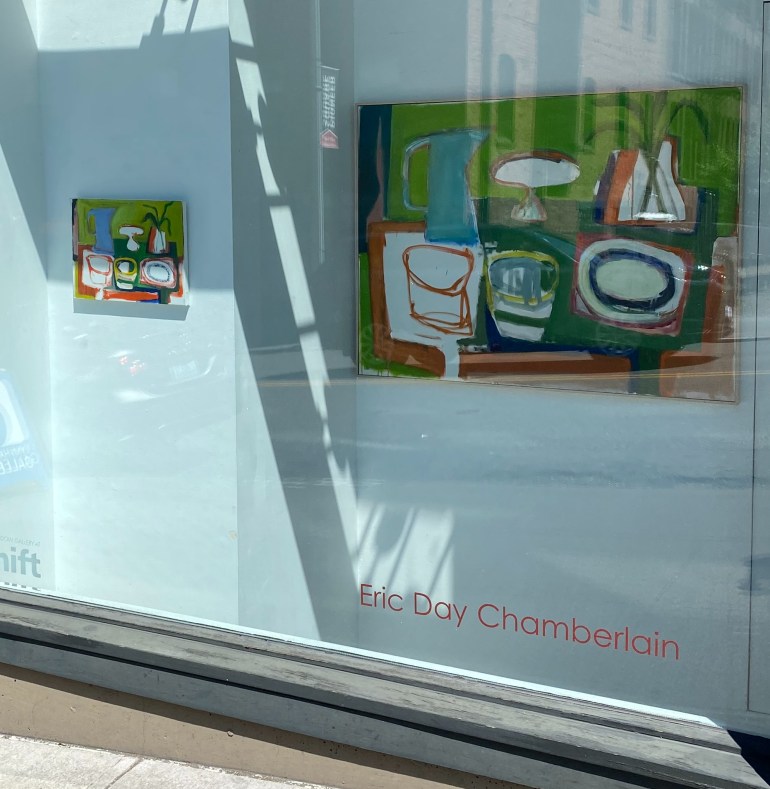 Eric’s paintings primarily focus on flattened perspectives of tabletop settings with an emphasis on simple forms, expressive mark making and bold colors.