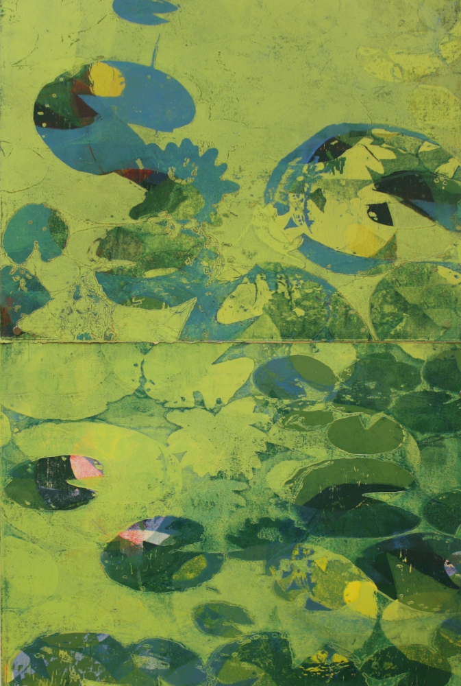 These prints are an exploration of color and shape using large woodcut blocks of waterlilies.