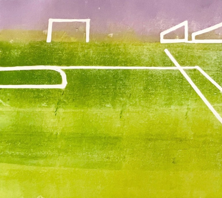 Meg’s inspiration for these pieces and the series following was prompted by a walk through Battle Point Park. The geometry seemed to be its own language playing against these large areas of color and light insinuating a a sense of serenity.