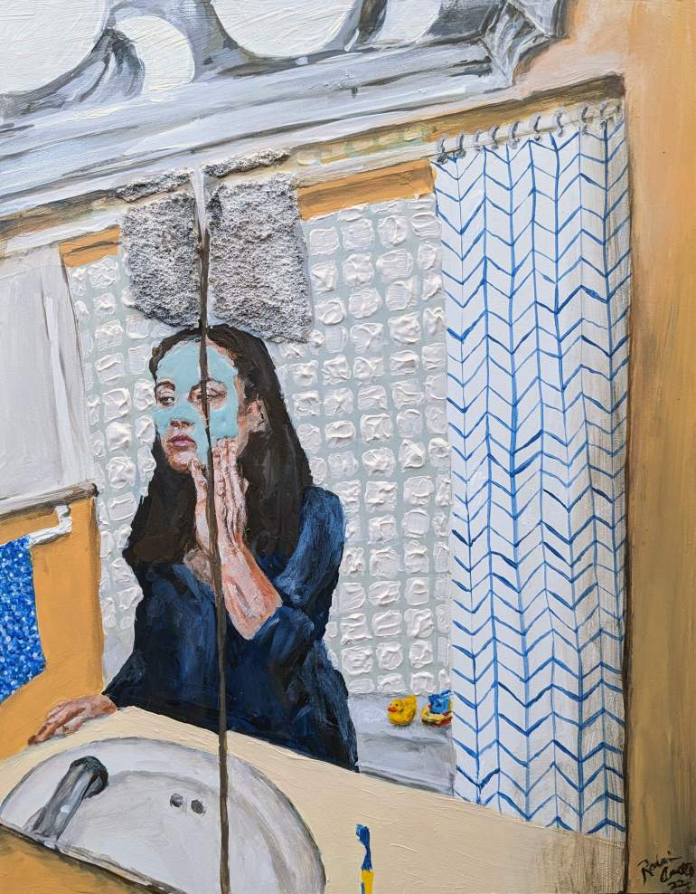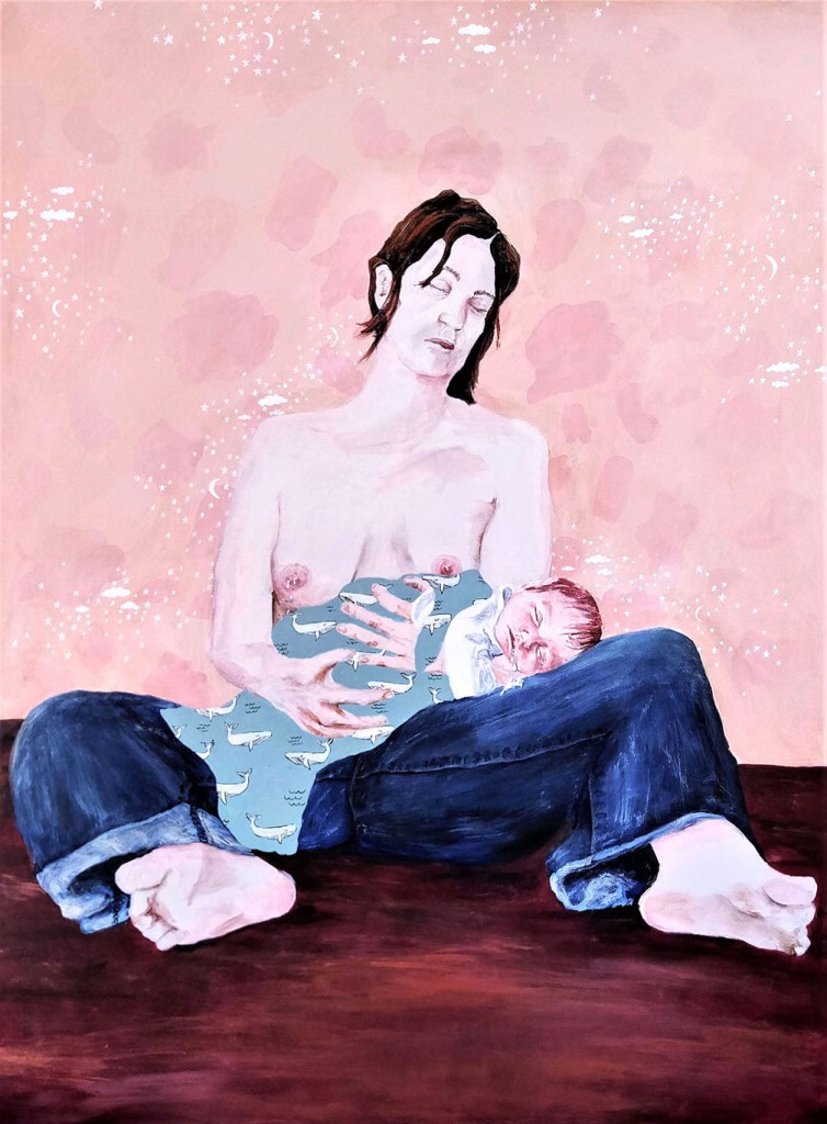 The work in the window is about motherhood, from the mother’s perspective, whether it is straightforward, like breastfeeding in Milk Drunk, or subtly in Moisturize through a nighttime routine with objects like a kid’s toothbrush and bath toys implying what’s going on in the subject’s life.