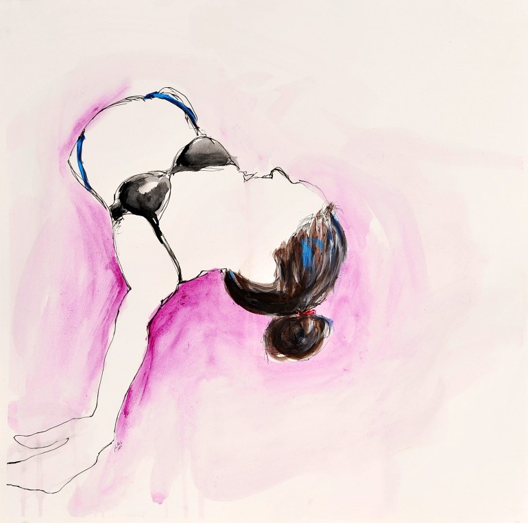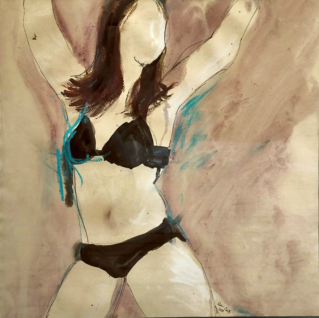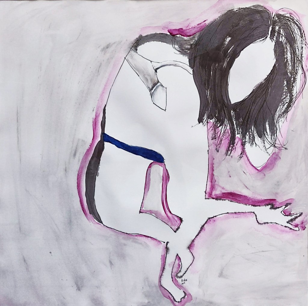 This series of self-portraits is a study of capturing primal body movement using expressive mark-making with acrylic, ink and pastel on paper.